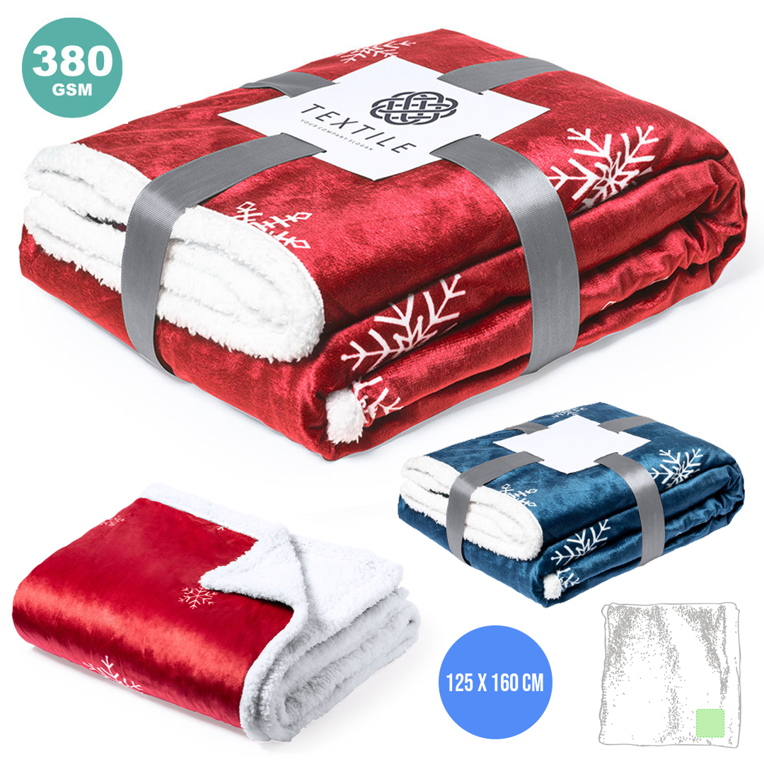 Suave y cálida manta de 125x160cm con decoración navideña. Fabricada en combinación de materiales coral fleece y sherpa de 380g/m2, muy confortables y acogedores. Presentada en cinta con lámina para fácil impresión. Anti-Pilling