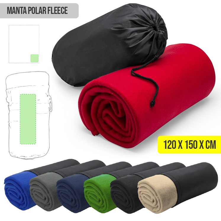 Manta de 120x150cm en variada gama de vivos colores. En material polar fleece de 180g/m2 y con funda de cierre de cordón en suave poliéster. Funda Poliéster