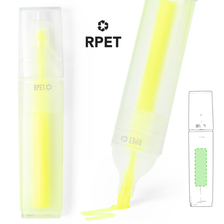 Marcador fluorescente de línea nature fabricado en RPET, elaborado a partir de plástico reciclado para así fomentar la reutilización de residuos plásticos y ayudar a la sostenibilidad del planeta. Con cuerpo transparente y capucha a juego. Con distintivo RPET impreso en el marcador.