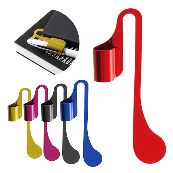 Original marcapáginas de acabado en aluminio brillante, en variados colores y con soporte para bolígrafo integrado. Presentado en funda de PVC.