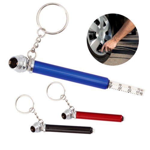 Llavero medidor de presión para neumáticos con cuerpo acabado en aluminio de vivos y variados colores.