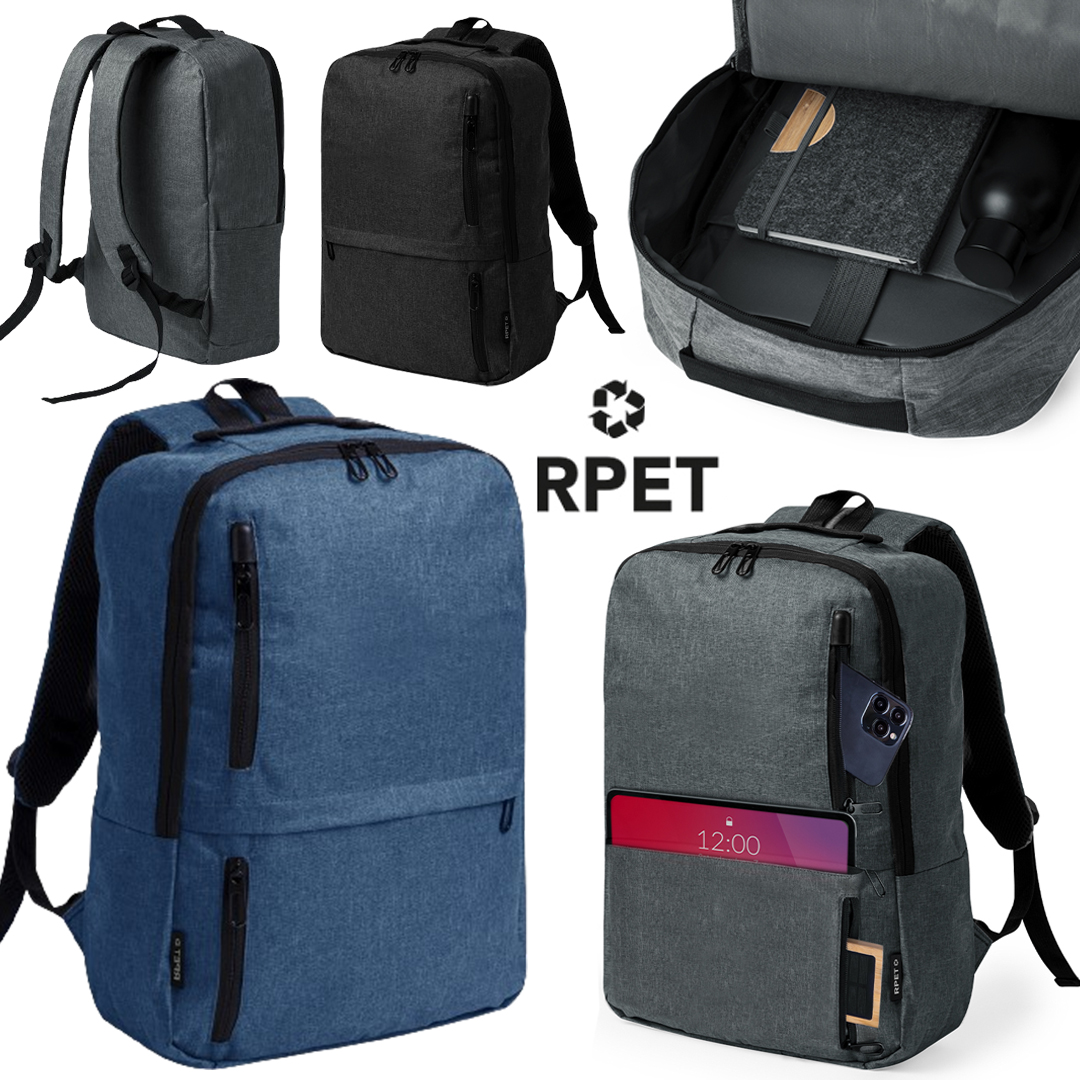 Mochila elaborada en resistente 600D RPET. Equipada con un cierre de cremallera de doble tirador y tres bolsillos frontales de acceso rápido. En su interior, cuenta con compartimentos acolchados diseñados para tablet de hasta 10 pulgadas y portátil de hasta 15 pulgadas. Las cintas de hombros son acolchadas y ajustables para brindar comodidad. Además, presenta una cinta superior y bolsillo lateral para mayor funcionalidad. Disponible en tres elegantes colores, con cremalleras negras. Logotipo RPET en etiqueta. Presentada en una bolsa individual reciclada. El material RPET se elabora a partir de plástico reciclado, para así fomentar la reutilización de residuos plásticos y ayudar a la sostenibilidad del planeta. Bolsillo Acolchado para Portátil y Tablet. Parte Trasera y Cintas Acolchadas