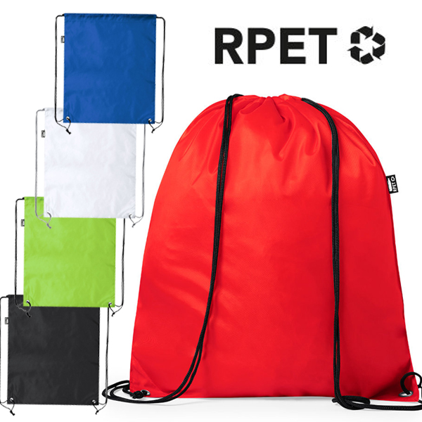 Mochila de cuerdas en suave poliéster RPET. Con cuerdas autocierre, esquinas reforzadas y resistentes argollas metálicas. Distintivo RPET en etiqueta lateral y disponible en variada gama de colores (color blanco especialmente fabricado para impresión en sublimación).Elaborado a partir de plástico reciclado, para así fomentar la reutilización de residuos plásticos y ayudar a la sostenibilidad del planeta.