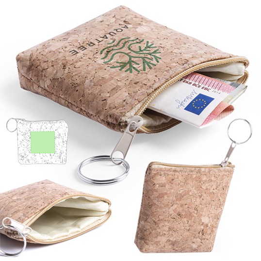 Monedero ecológico de diseño cuadrado en corcho natural y con suave forro interior. Compartimento principal con apertura de cremallera a juego y anilla llavero para transporte. Con Forro Interior