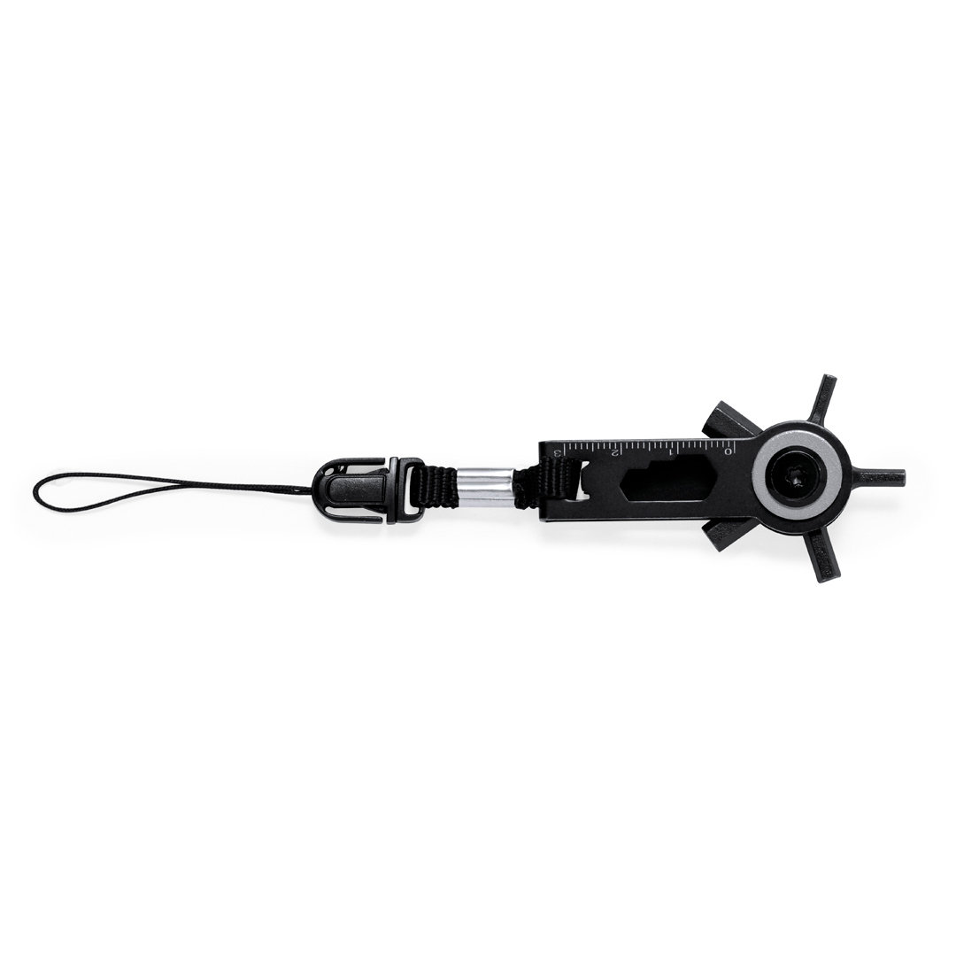 Eficaz multiherramienta con cabezal giratorio fabricada en acero inox y acabado en negro. Con 10 funciones: llaves allen, llave para tuercas hexagonales en varios tamaños, regla y un práctico accesorio de transporte con cierre de hebilla. Presentado en bolsa de papel reciclada de diseño kraft. 10 Funciones