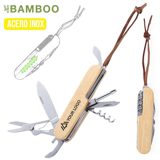 Navaja multiusos de línea nature, en combinación de materiales bambú y acero inox, con 9 funciones. Incluye navaja, abridores, tijeras, lima, destornillador, sacacorchos… Con cinta para transporte en polipiel y presentada en caja individual. 9 Funciones