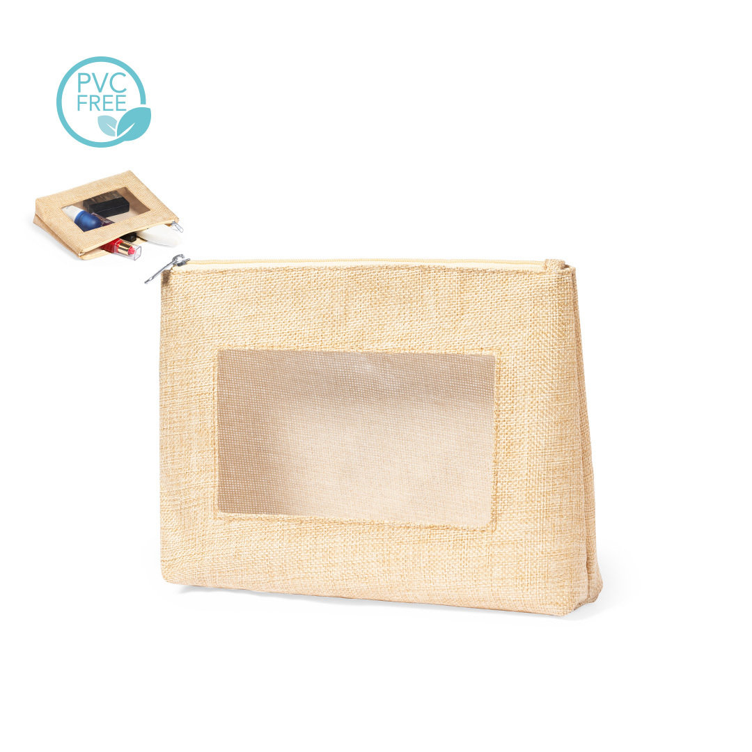 Neceser de inspiración nature con ventana en un lado. Con cierre de cremallera a juego y de acabado cosido. Fabricado en poliéster de tono crudo, con ventana en EVA transparente.