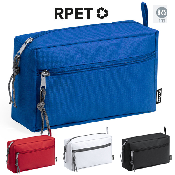 Neceser de línea nature en RPET, elaborado a partir de plástico reciclado, para así fomentar la reutilización de residuos plásticos y ayudar a la sostenibilidad del planeta. Compartimento principal y bolsillo frontal con cierre de cremallera, con cintas en tiradores para cómoda apertura. Asa de transporte a juego y distintivo RPET en etiqueta lateral. Disponible en variada gama de colores.