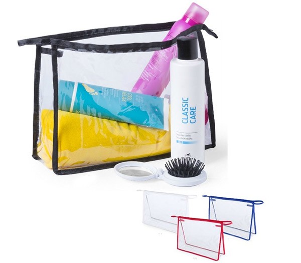 Neceser multiusos en resistente PVC transparente con ribetes de refuerzo en vivos colores. Con cremallera y asa de transporte a juego.