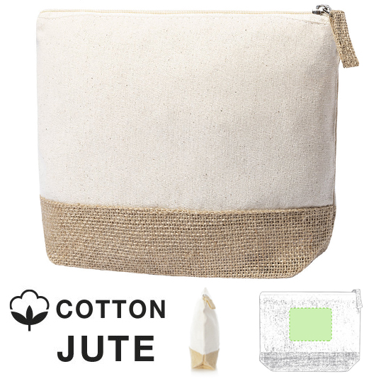 Neceser de línea nature en combinación de yute laminado y algodón natural. Con cierre de cremallera y tirador en yute a juego.