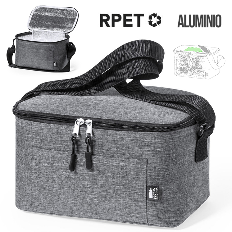 Nevera de línea nature y en resistente poliéster 600D RPET efecto melange, elaborado a partir de plástico reciclado para así fomentar la reutilización de residuos plásticos y contribuir a la sostenibilidad del planeta. Detalles en negro y base reforzada. Compartimento principal con cierre de cremallera e interior en aluminio. Incluye bolsillo exterior y cinta bandolera ajustable, con distintivo RPET en etiqueta exterior.