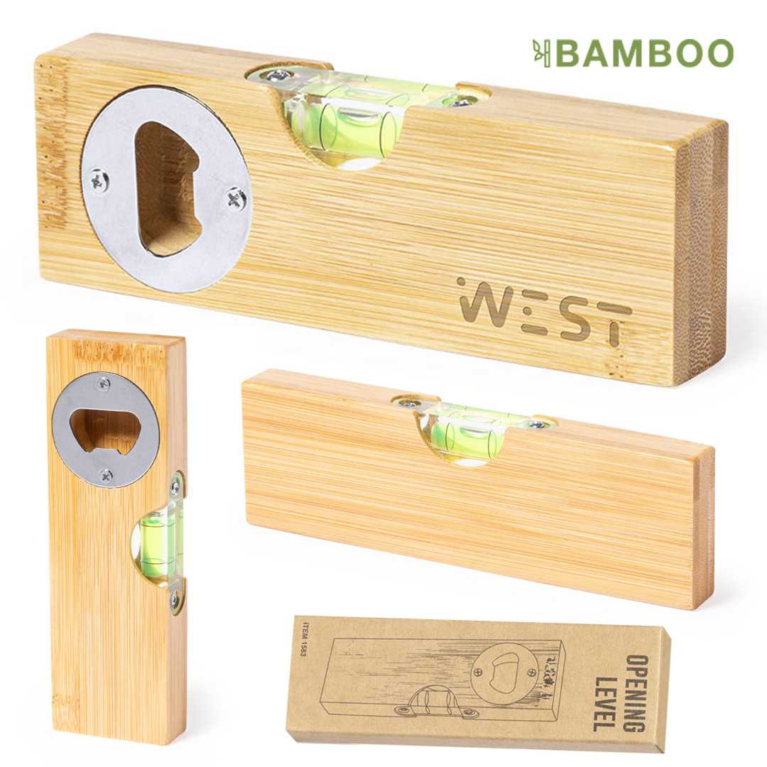 Nivel de línea nature fabricado en bambú, con abridor metálico integrado. Presentación en caja individual de diseño kraft.