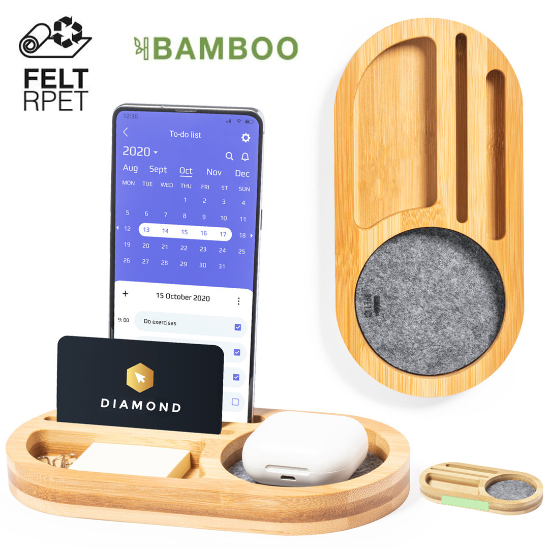 Organizador de línea nature fabricado en bambú en combinación con fieltro RPET. Con función soporte para smartphone, varios compartimentos extra para objetos y amplia superficie de marcaje. Con distintivo fieltro RPET y presentado en caja individual de diseño kraft. El fieltro RPET reciclado es fruto de la combinación del proceso de reciclaje de materiales plásticos junto con la técnica milenaria de fabricación del fieltro, dando como resultado un material de eco-tendencia que, además de ser de origen reciclado, también se convierte en reciclable.