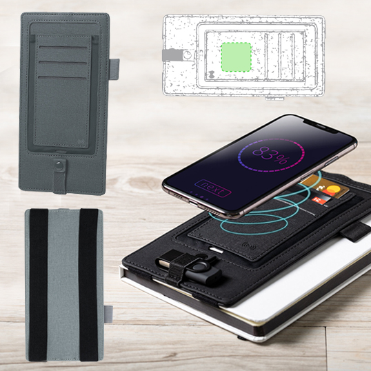 Elegante y práctico organizador cargador en polipiel. Cargador inalámbrico integrado con luz indicadora de carga y ajustable a cualquier tamaño de bloc de notas. Incluye soporte para bolígrafo y multitud de bolsillos para tarjetas y otros accesorios. Disponible en variada gama de colores, con cierre de corchete y bandas elásticas. Cable micro USB incluido. Inalámbrico 5W