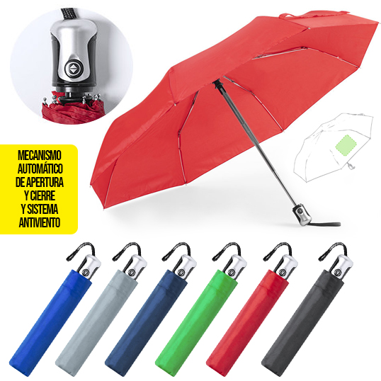 Paraguas plegable de 8 paneles y 98cm de diámetro. Tela en resistente poliéster 190T, con mecanismo automático de apertura/cierre y sistema antiviento. Varillas metálicas en color plata y fibra de vidrio. Cierre de velcro y mango ergonómico con cinta de transporte. Incluye funda a juego. 21"". Apertura y Cierre Automáticos. Sistema Antiviento. Funda Poliéster