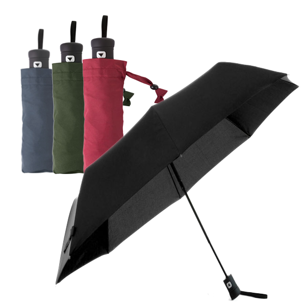 Paraguas plegable de alta calidad de 8 paneles en sobrios colores. De 98cm de diámetro, con apertura automática y en resistente material pongee. Con varillas metálicas en color negro, cierre de velcro y mango ergonómico con cinta de transporte. Presentado en funda individual a juego. 22"". Automático. Funda Pongee