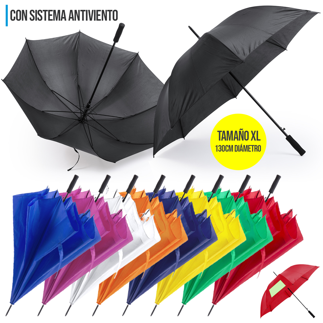 Paraguas de 8 paneles tamaño XL -130cm diámetro- con sistema antiviento. Apertura automática, en resistente poliéster y con varillas de fibra en color negro. Con mango acolchado de EVA y cierre de velcro. Disponible en extensa gama de colores. 30"". Automático. Sistema Antiviento. Mango EVA