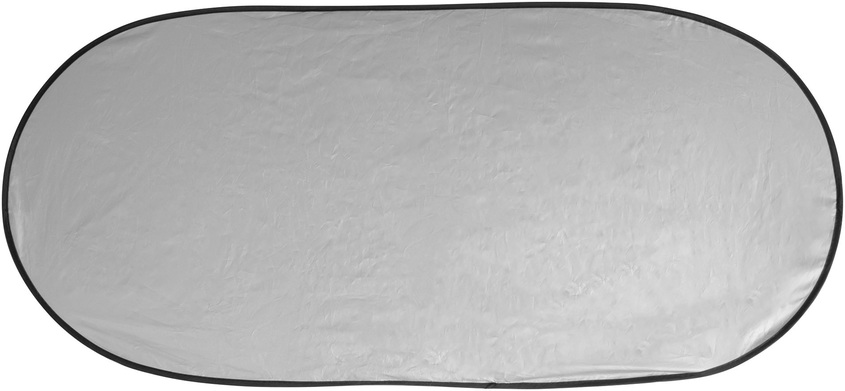 130 x 60 cm. Poliester con recubrimiento plata. Parasol plegable. Diámetro de la bolsa contenedora : 35 cm.