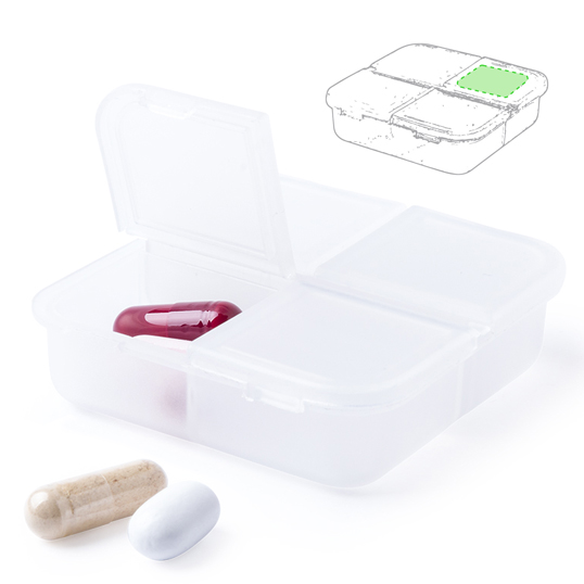 Pastillero de 4 compartimentos en material ABS de acabado translúcido y libre de BPA. Con tapa individual por compartimento. 4 Compartimentos