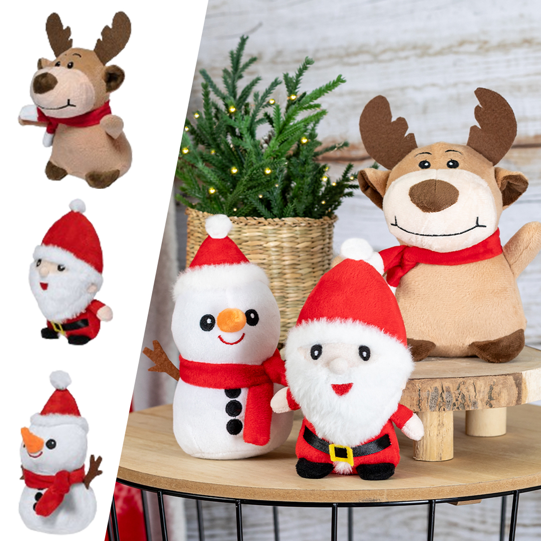 Suaves y adorables peluches con motivos navideños. Disponibles en tres divertidos y originales diseños: Papa Noel, Muñeco de Nieve y Reno. Presentado en bolsa individual reciclada.