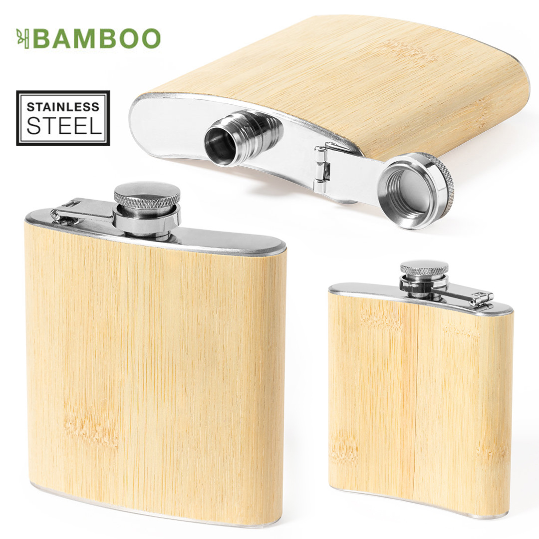 Petaca de línea nature y 170 ml de capacidad. Exterior en bambú de suave acabado, con cuerpo de acero inox y tapón de seguridad a rosca. De diseño ergonómico para guardar cómodamente en el bolsillo. Presentada en caja individual de diseño eco en cartón kraft. 200 ml