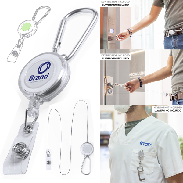 Porta objetos extensible de sobrio diseño, con cinta de fijación de cierre de botón y mecanismo extensible de hasta 65 cm. Incluye mosquetón metálico de enganche. Especialmente diseñado para fijar objetos de uso cotidiano y obtener fácil acceso a los mismos (llaveros anticontacto, punteros de seguridad...). Amplia superficie de marcaje en la pieza central. Extensible. Clip Incluido