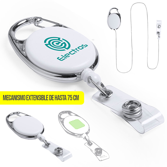 Porta acreditaciones extensible de sobrio diseño, con accesorio de cierre de botón para colgar la acreditación y con mecanismo extensible de hasta 75 cm. Con mosquetón de enganche metálico y amplia superficie de marcaje Extensible. Clip Incluido
