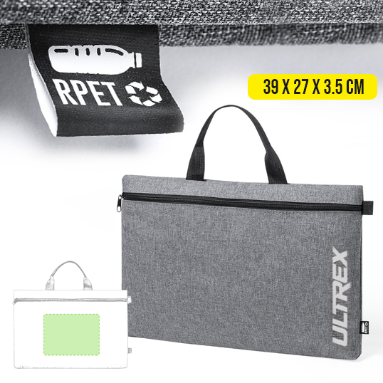 Portadocumentos de línea nature y en resistente 600D RPET efecto melange, elaborado a partir de plástico reciclado para así fomentar la reutilización de residuos plásticos y contribuir a la sostenibilidad del planeta. Detalles en negro y compartimento principal con cierre de cremallera. Resistentes asas a juego y distintivo RPET en etiqueta exterior.