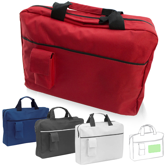 Portadocumentos de cierre de cremallera en suave acabado de poliéster 600D de vivos colores. Con asas de transporte con refuerzo a juego y bolsillo frontal para smartphone con cierre de velcro.