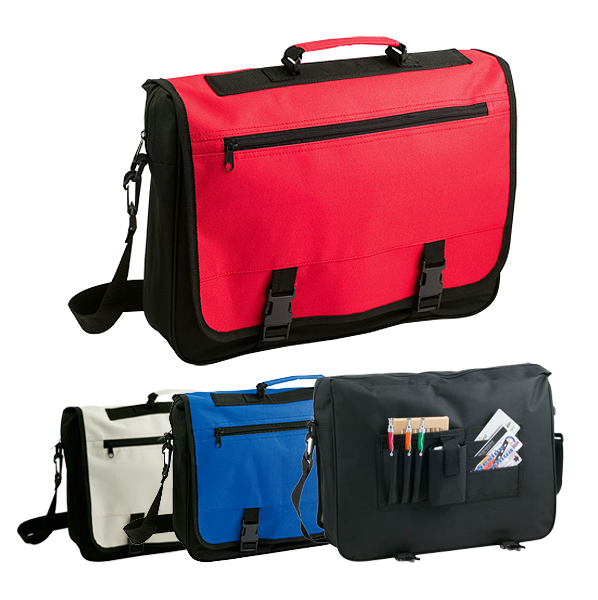 Portadocumentos con solapa de cierre de velcro en poliéster 600D con elegante tira frontal en color negro. Con asas de transporte reforzadas y cinta bandolera ajustable. Compartimentos interiores para bolígrafos y funda para smartphone en PVC con función táctil.