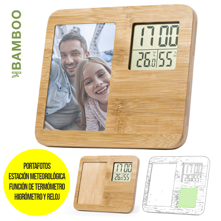 Portafotos estación meteorológica de línea nature, fabricada en bambú pulido y con funciones termómetro, higrómetro y reloj. Para fotos de 9x14cm y con reloj con alimentación a pilas (de botón incluidas). Presentado en atractiva caja de diseño eco. Disponible manual de instrucciones en español e inglés. Fotos: 9 x 14 cm. Pila Botón Incluida