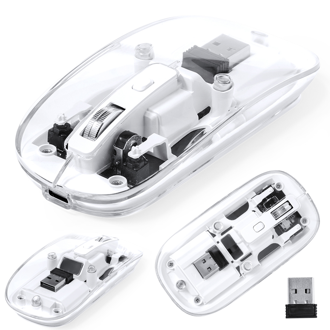 Ratón óptico inalámbrico de original diseño, con cuerpo transparente que permite ver los componentes internos del dispositivo. Con batería integrada de 300 mAh y con puerto de carga Tipo C (cable incluido). Incluye botón DPI, con conexión “plug and play” por USB y viene presentado en caja individual de diseño kraft. Inalámbrico. Óptico. Botón DPI. Batería 300 mAh