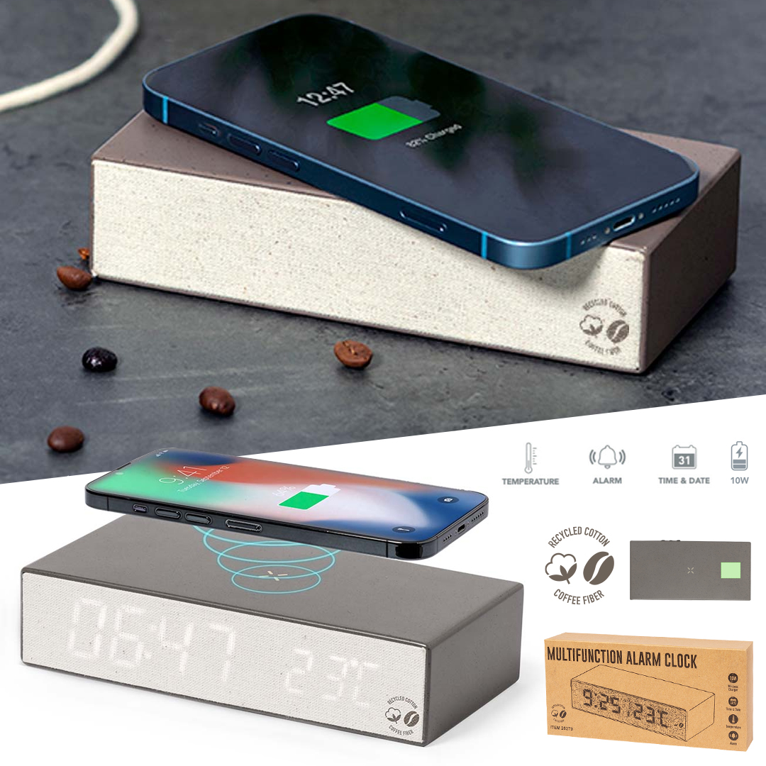 Reloj multifunción con cargador inalámbrico 10W integrado. Fabricado en en fibra de café y algodón reciclado. Función hora (12/24h), alarma, con intensidad de luz regulable. Alimentación mediante conexión USB. Compatible con dispositivos equipados con tecnología de carga inalámbrica y presentado en atractiva caja de diseño kraft. Con distintivo de fibra de café y algodón reciclado. Incluye manual de instruccions en español e inglés.La fibra de café es una solución circular que se obtiene de la utilización de los residuos producidos en la obtención del café. Una alternativa sostenible que favorece la reducción del uso de plásticos, ahorrando energía en su proceso de fabricación y contribuyendo al cuidado del medio ambiente.Disponible certificación GRS (Global Recycled Standard / Estándar de Reciclaje Global), que garantiza el origen reciclado del material usado para fabricar el producto. Cargador Inalámbrico 10W. Intensidad de Luz Regulable. Conexión USB
