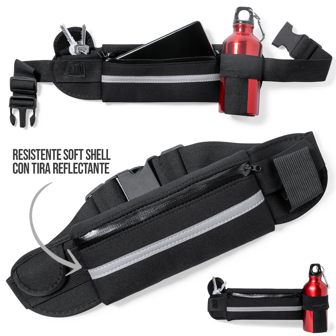 Riñonera de alta calidad fabricada en resistente soft shell (neopreno), con tira reflectante. Compartimento principal con cierre de cremallera, soporte elástico para bidón y bolsillo para llaves y otros pequeños objetos. Con cierre de hebilla y cinta ajustable, especialmente diseñada para actividades deportivas y de ocio. Reflectante