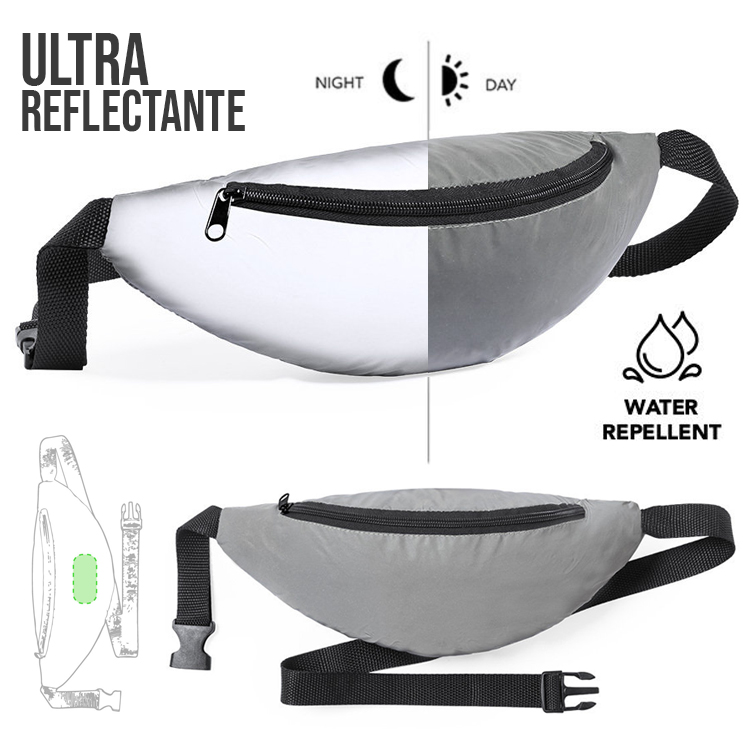 Riñonera en resistente poliéster 210T. Fabricada empleando tejido con gran capacidad para reflejar intensamente la luz, gracias a millones de pigmentos reflectantes y basándose en el principio de la retro-reflexión de la luz, una propiedad de visibilidad nocturna que consiste en la refracción de la luz hacia la fuente de origen de la misma. Con bolsillo de cierre de cremallera y cinta con cierre de hebilla ajustable. Diseñada para el día a día y actividades de ocio. Resistente al agua. Reflectante