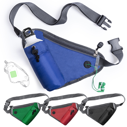 Riñonera con diseño triangular en suave poliéster 210D de variados colores. Diseñada para actividades deportivas y de ocio. Con bolsillo de cierre de cremallera, salida de auriculares, bolsillo ajustable para bidón y cintura con cierre de clic ajustable. -Bidón no incluido- Parte Trasera Acolchada