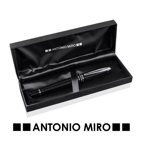 Roller de capucha de Antonio Miró en elegante diseño bicolor y suave cuerpo metálico en sobrio color negro. Con logotipo de la marca bajo la anilla, clip y punta en acabado plateado brillante. Presentado en estuche individual en color negro con logotipo de la marca. En tinta azul. Carga Jumbo