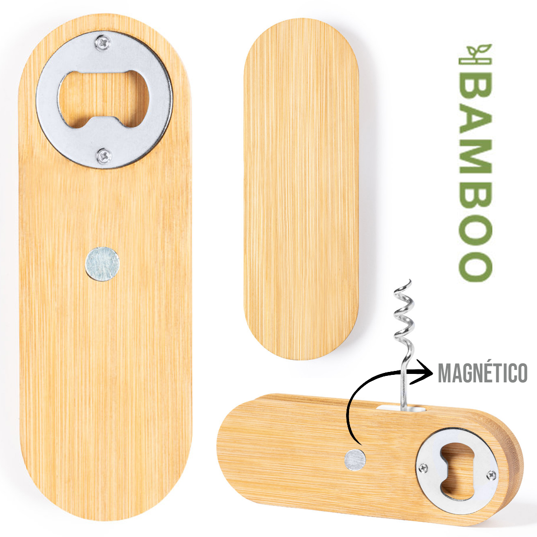 Original sacacorchos abridor magnético de línea nature, fabricado en resistente bambú. Con sacacorchos integrado en cuerpo y sistema de apertura metálico. Magnético