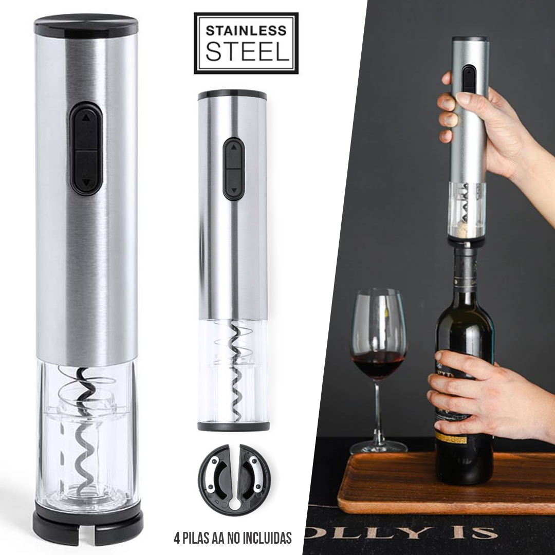 Sacacorchos eléctrico fabricado en acero inox y resistente ABS, con cortacápsulas incluido. Presentado en caja individual de diseño, con manual de instrucciones en español e inglés. Alimentación a pilas (4xAA no incluidas). 4 Pilas AA No Incluidas