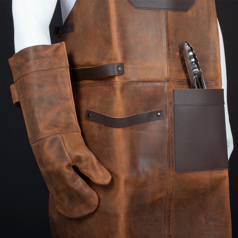 Un regalo fuera de serie. Deluxe set de Asador, contiene Pechera de Asador BBQ en cuero curtido, envejecido y suavizado 100% genuino color café cognac, con cintas y porta-accesorios de Cuero 100% genuino color café oscuro. Remaches de acero envejecido y 2 bolsillos delanteros de 22 x 18 cm. y 18 x 14 cm. Rectángulo para logo de 10 x 5 cm. Contiene además largo mitón de Asador BBQ en cuero curtido, envejecido y suavisado 100% genuino color café cognac y tenazas de Acero inoxidable. Presentación en elegante caja de regalo de cartón negro con ventana de mica transparente y gráfica a todo color con descripción de los elementos del set.