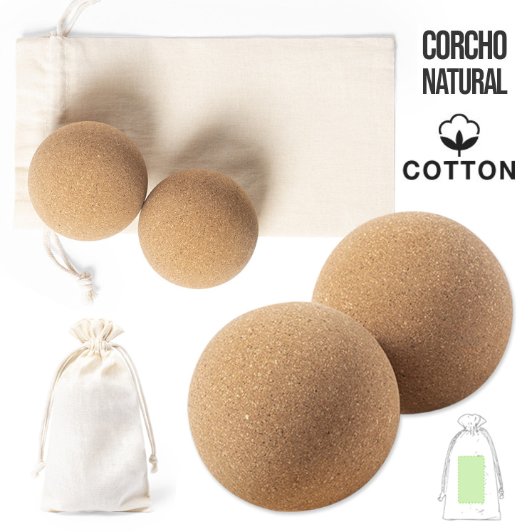 Set de 2 bolas de línea nature para la práctica del yoga y otras actividades. Fabricadas en resistente corcho natural y presentadas en funda de algodón con cierre de cordón. Con ilustraciones de ejercicios. 2 Piezas. Funda Algodón
