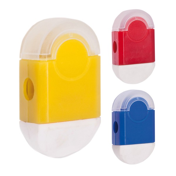 Set de goma y sacapuntas en vivos colores. Compartimento para residuos con capucha transparente. Goma y Sacapuntas