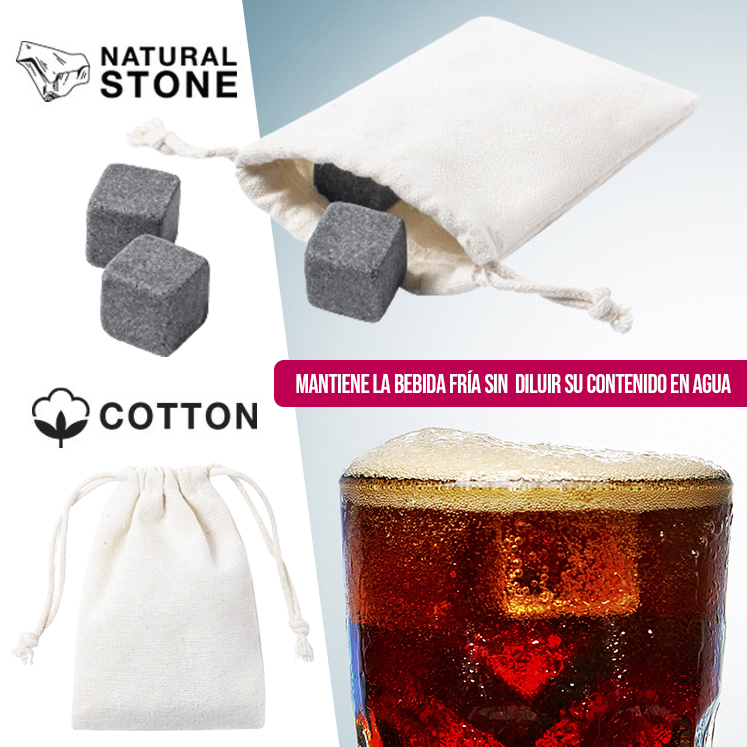 Set de 4 cubitos reutilizables. Fabricados en piedra natural esteatita, también conocida como piedra o roca de jabón, que mantiene la bebida fría sin alterar sus propiedades al no diluir su contenido en agua, además de mantener el sabor original de la misma. Presentados en funda de algodón con cordón de cierre. Reutilizable. 4 Piezas. Funda Algodón