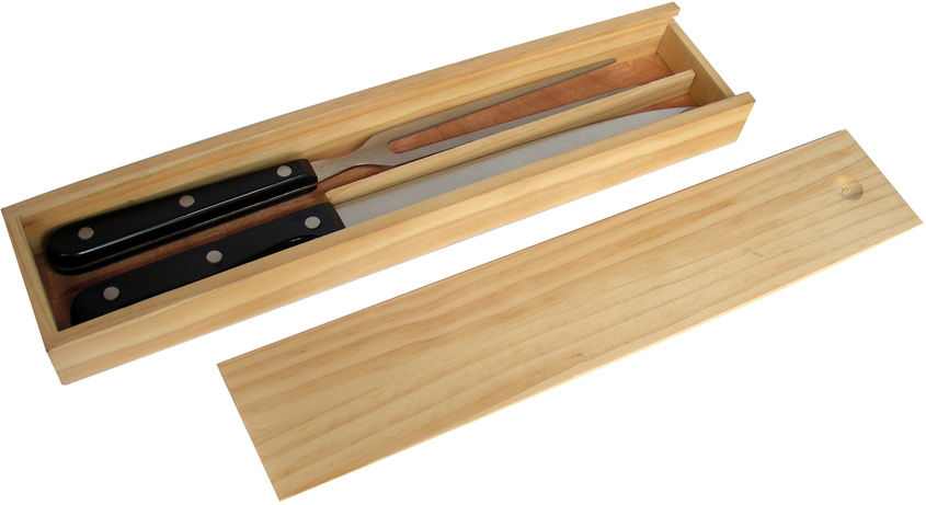 34 x 7,3 x 4,1 cm. Acero inoxidable y polipropileno + Madera. Juego de cuchilla y trincheta en caja de madera. Presentación en caja de regalo.