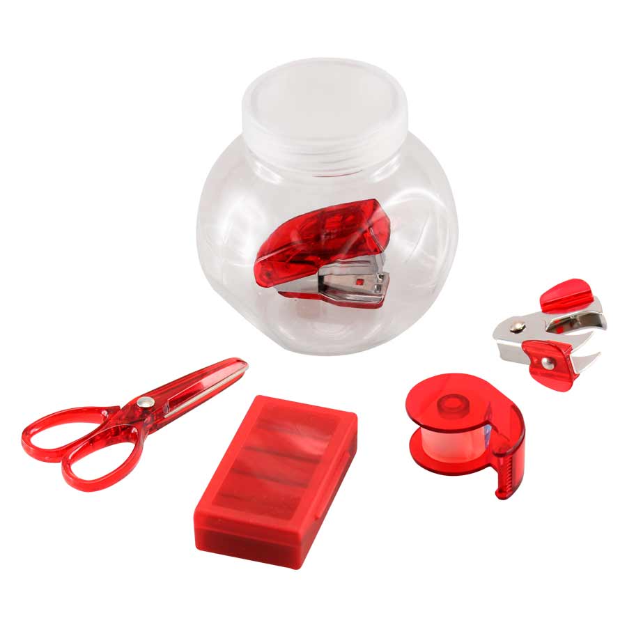 Set de oficina en frasco plástico transparente con tapa frozen. Ideal espacio para logo en tapa.