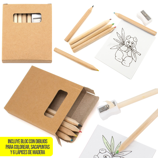Set de 8 piezas en caja de cartón de acabado natural con ventana. Incluye bloc con dibujos para colorear, sacapuntas y 6 lápices de madera con cuerpo cilíndrico y minas en variados colores. 8 Piezas. Bloc 20 Hojas