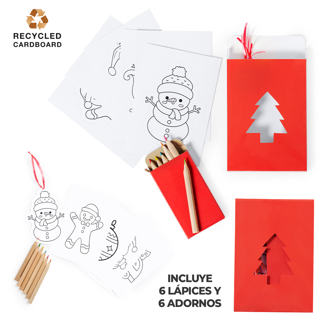 Set de adornos con 6 originales diseños navideños para colorear y decorar el árbol de navidad. Incluye 6 lápices de madera en diferentes colores. Fabricados en cartón y presentados en una bolsa reciclada. 6 Lápices y 6 Adornos Incluidos