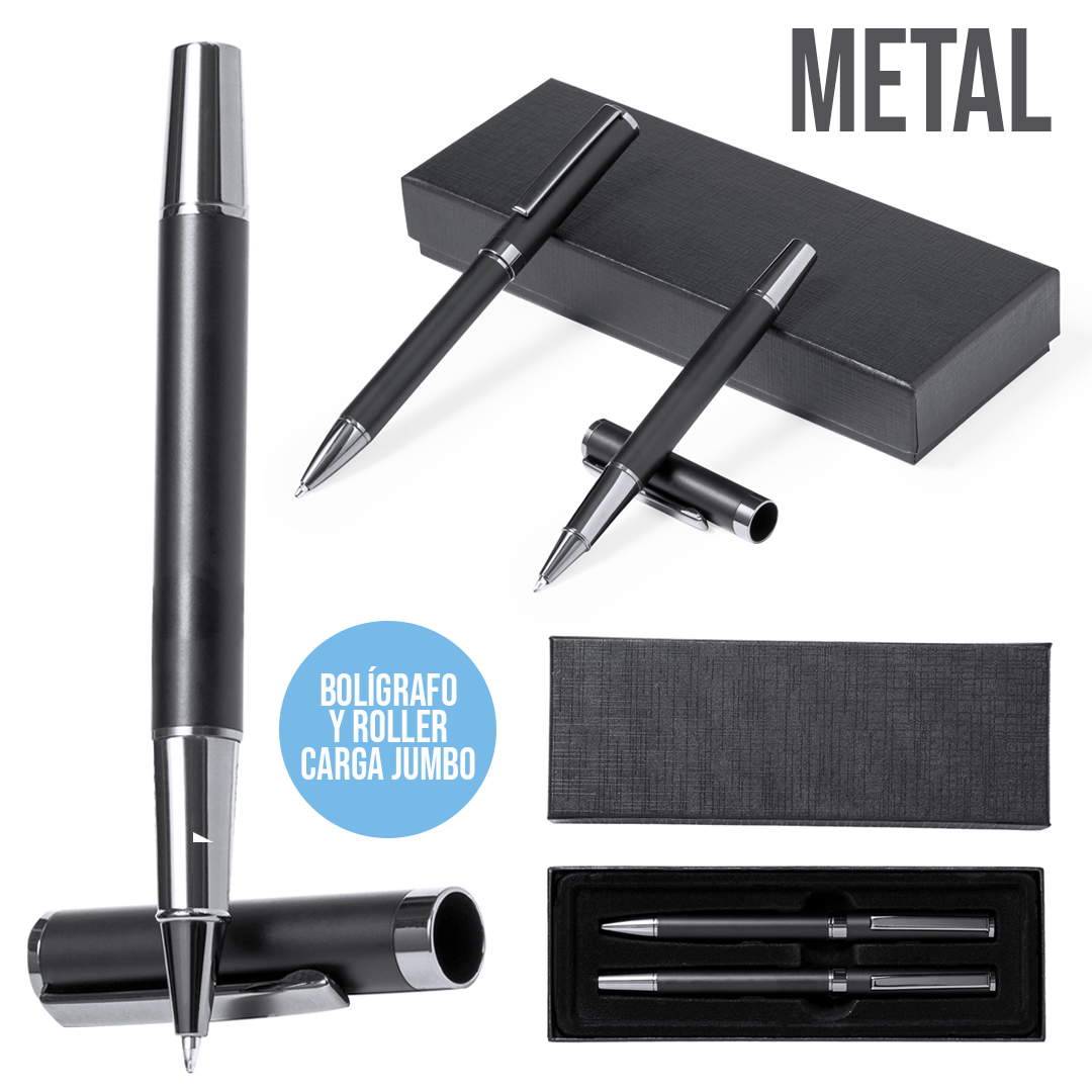 Elegante set de bolígrafo y roller. Bolígrafo de mecanismo giratorio y roller con capucha, ambos provistos de un clip metálico. Con tinta azul, su cuerpo presenta un elegante acabado negro mate y sutiles detalles cromados. Presentados en un estuche kraft negro, con interior troquelado en tacto de terciopelo. Bolígrafo y Roller. Carga Jumbo
