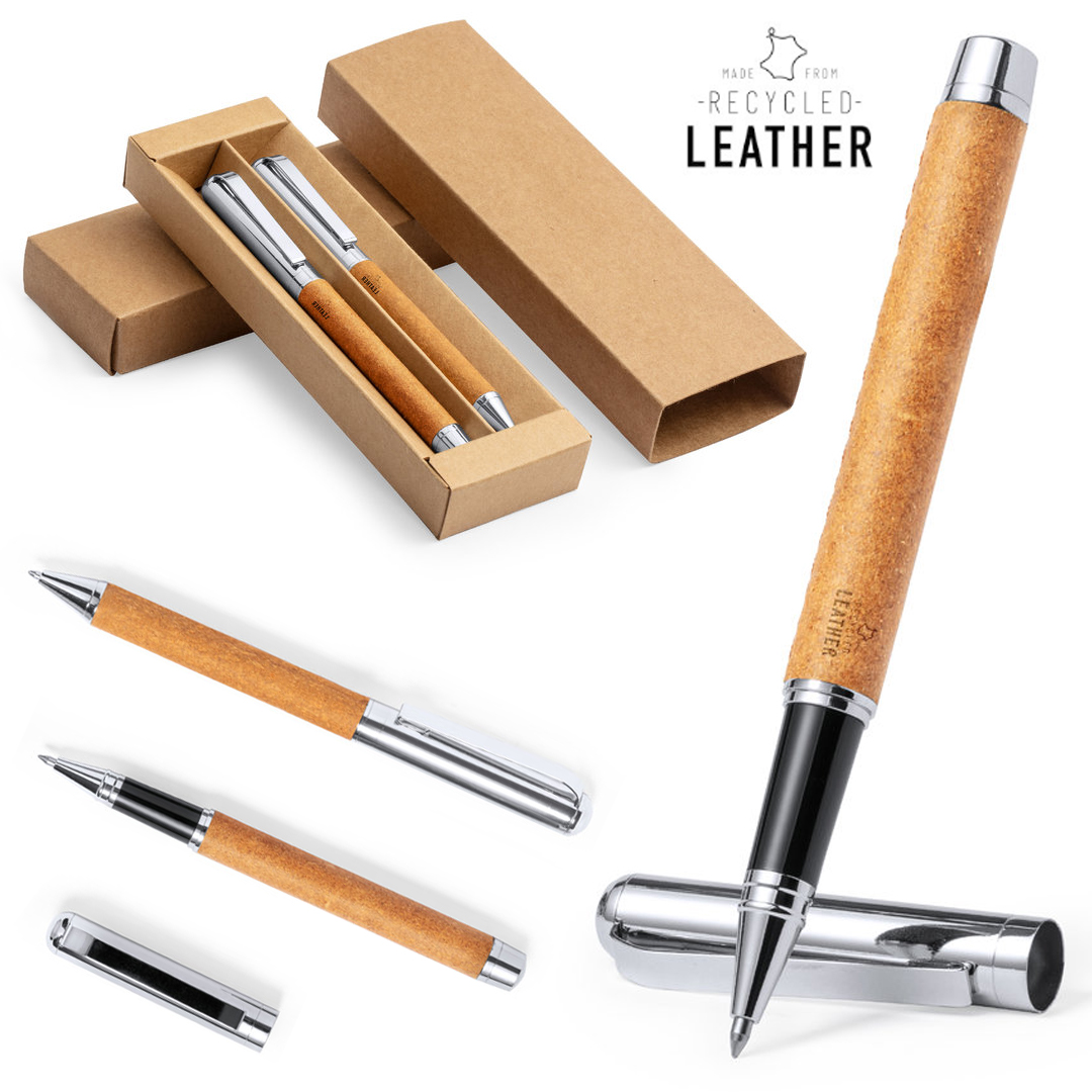 Set de bolígrafo y roller metálicos, con cuerpo recubierto en cuero reciclado. Incluye: Bolígrafo fabricado en metal cromado y con cuerpo recubierto en cuero reciclado. Elegante clip metálico y accesorios a juego. De mecanismo giratorio y en tinta azul, con distintivo cuero reciclado en cuerpo.Roller fabricado en metal cromado y con cuerpo recubierto en cuero reciclado. Elegante clip metálico y accesorios a juego. Con capucha y en tinta azul, con distintivo cuero reciclado en cuerpo.Set presentado en estuche individual de diseño kraft con funda a juego.El cuero reciclado rescata las fibras desechadas en los procesos de fabricación del cuero, minimizando el desperdicio de material, contribuyendo a reducir el impacto ambiental y manteniendo a la vez sus propiedades originales. Bolígrafo y Roller. Carga Jumbo