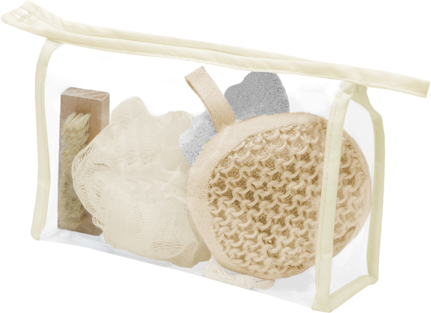 18,5 x 12 x 5 cm. Plástico. Set con 2 esponjas una es exfoliante, piedra/lima y cepillo para uñas.
